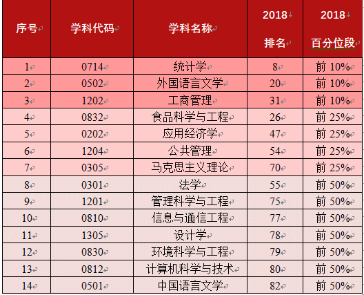 11月1日,2018软科“中国最好学科排名”正式发布,搜书吧 共有14个学科上榜。统计学、外国语言文学、工商管理3个学科进入全国前10%,其中,统计学位列全国第8;食品科学与工程等4个学科进入全国前25%;法学等7个学科进入全国前50%。