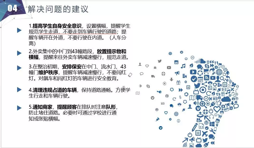 校园内网络信号问题也一直是师生都十分关注的方面,而移动网络基站信号覆盖存在问题,造成学校不同区域不同运营商的移动网络无法正常运作,一定程度上影响了教职工及学生正常的工作学习生活。针对这一现象,来自管理学院的3号提案团队进行了为期40天的调研、7次实地考察,通过对225份问卷进行数据分析和联系相关老师,提出增加信号基站以及信号加强器的数量,增大无线网络的覆盖面积和加大对数据网络以及无线网络的投资力度的解决方案。 论安全,从校园照明死角到校园交通隐患 统计学院的5号提案团队则关注到了校园路灯问题,他们发现夜晚校园路灯灯光过暗,易发生车辆与行人的摩擦碰撞事故等。由此,维权游击队的同学们通过实地调研和问卷走访之后,提出更换较亮灯管、增设地灯、及时维修破旧灯管、传统灯转换为声控灯等解决方案。