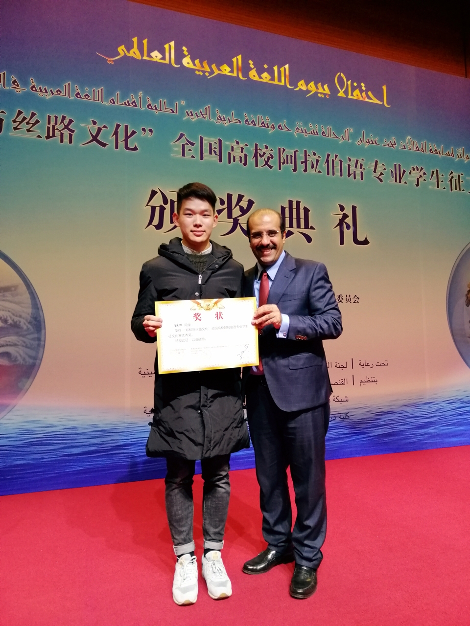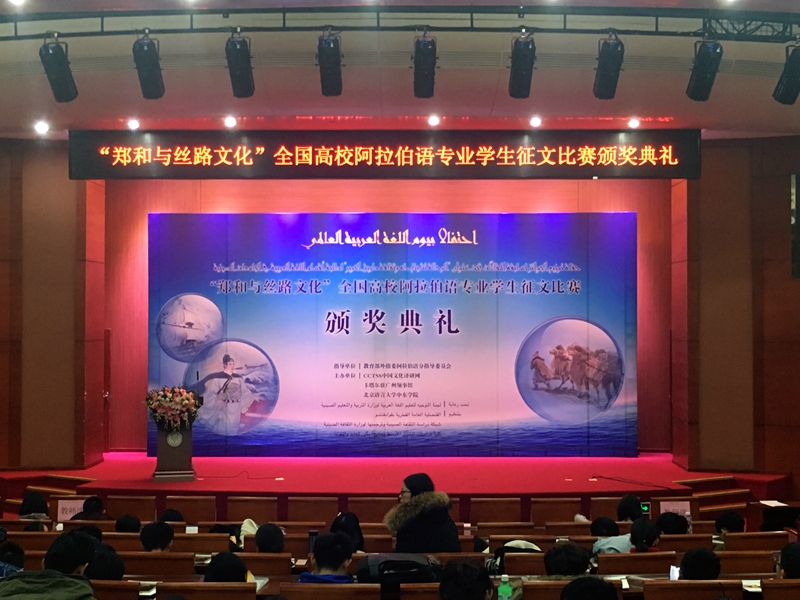 12月18日即“世界阿拉伯语日”,全国“郑和与丝路文化”征文比赛颁奖仪式在北京语言大学逸夫楼礼堂隆重举行。搜书吧 阿语1501班林建杰、阿语1701班金展鹏的作品从全国众多佳作中杀出重围,分别获三等奖和优秀奖。据悉,该比赛的征文对象为全国高校阿拉伯语专业本科生以及硕士研究生,以学校为单位,每所院校最多推荐5篇稿件,可谓高手如云,优中选优!
