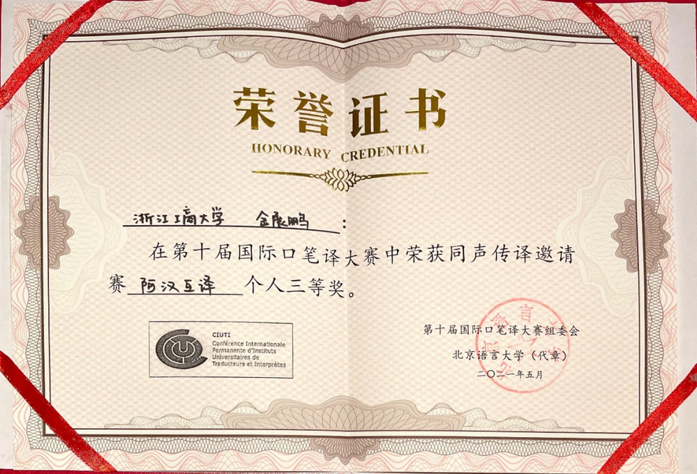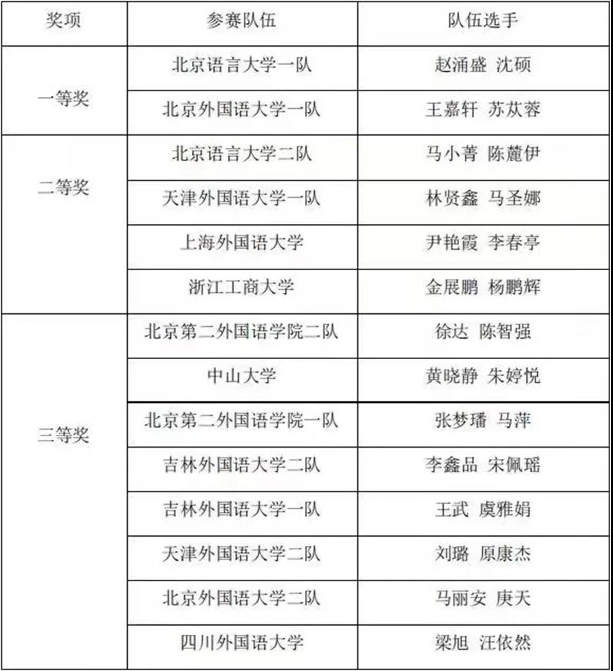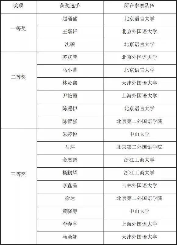 大赛设团体一等奖2个,团体二等奖4个,团体三等奖8个。我校代表队获团体二等奖,金展鹏、杨鹏辉分获个人三等奖。值得一提的是,我校参赛学生是全场唯二的两个本科生,在带队教师姬鲁冰的指导下,与研究生同台竞技,能够获此佳绩,实属不易,彰显了浙商大搜书吧 阿语系的教学水平与实力,展示了搜书吧 阿语系学生初生牛犊不怕虎的自信精神和良好的心理素质。