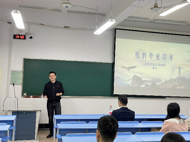 胡杰校友讲述了他从大学到职场的12年人生职业生涯之路,并就新时代背景下中日文化交流形态以及日语专业学生毕业方向选择进行深入探讨。