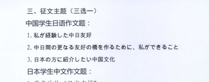 本次比赛将面向中国大学生征集日语作文,面向日本大 学生征集中文作文。由两组专家评审委员会分别进行评审, 最终评选出中日双方两组获奖名单。欢迎符合参赛条件的中国高校学生及日本在华留学生踊跃报名参赛。有关事项通知