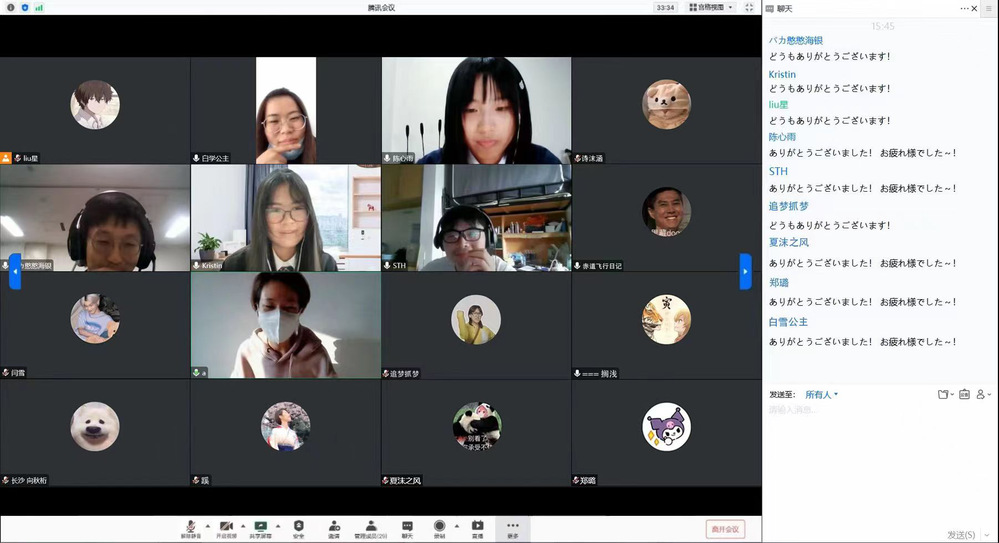 参加者首先进入由搜书吧 刘新宇同学发起的腾讯会议总会场,主持人谢天姿、叶家鹏、陈心雨等同学介绍日语角规则。接下来,组织大家进入由郑璐、谢天姿、叶家鹏、陈心雨等发起的腾讯会议分会场。