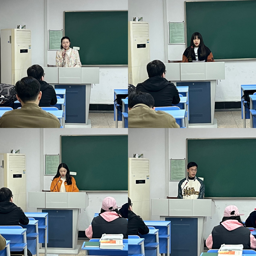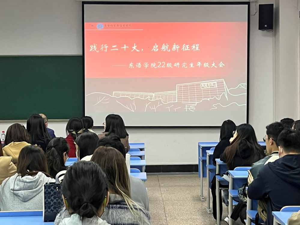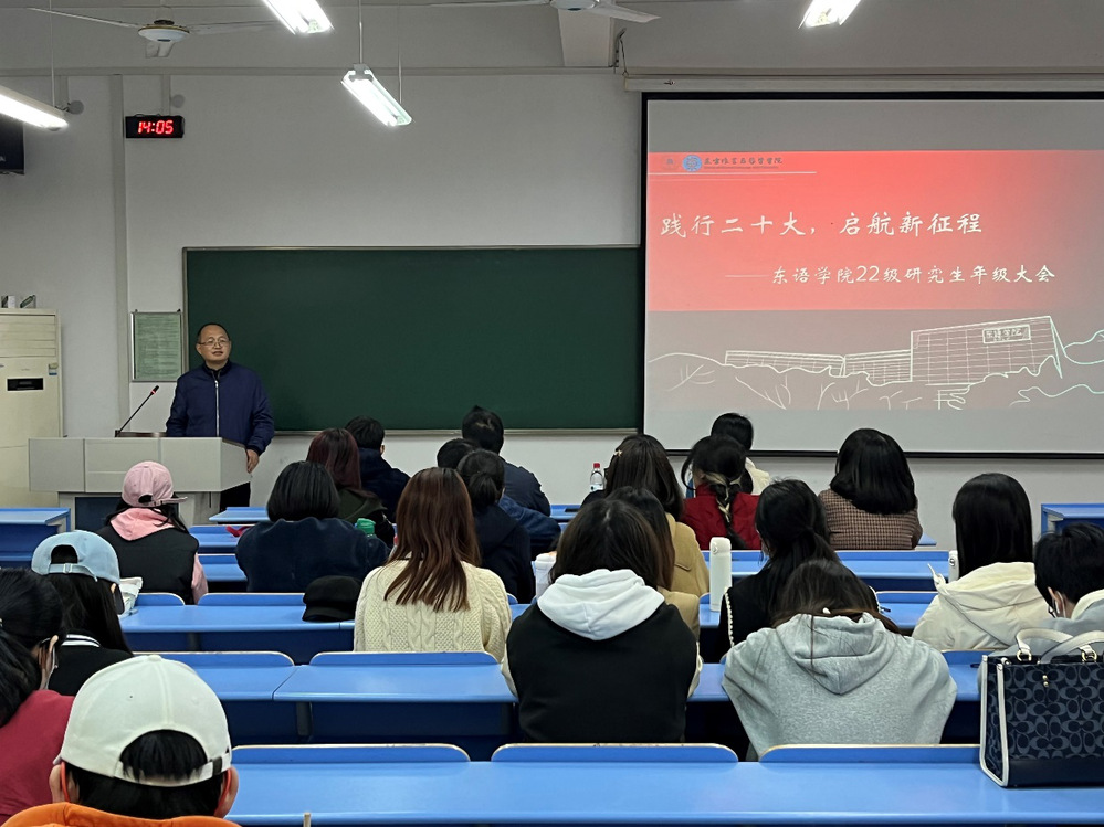 首先,四个专业的学生代表汇报了各自入校后的学习生活等情况。日语语言文学22研姚红妮分享了自己的志愿者活动经历,希望同学们能发现研究生生活中的点滴幸福;亚非语言文学22研陈子洋表达了今后将与老师、同学进行更多交流的期望;日语笔译22研娄茜煜认为同学们在研究生阶段应更加注重实践,提升自身专业素养,抱着积极的心态尽早进行职业规划;阿拉伯语笔译22研何俊锋则认为研究生阶段与本科阶段的学习一脉相承又存在着巨大差异,作为外语专业的学生,还应掌握更多语言之外的技能。