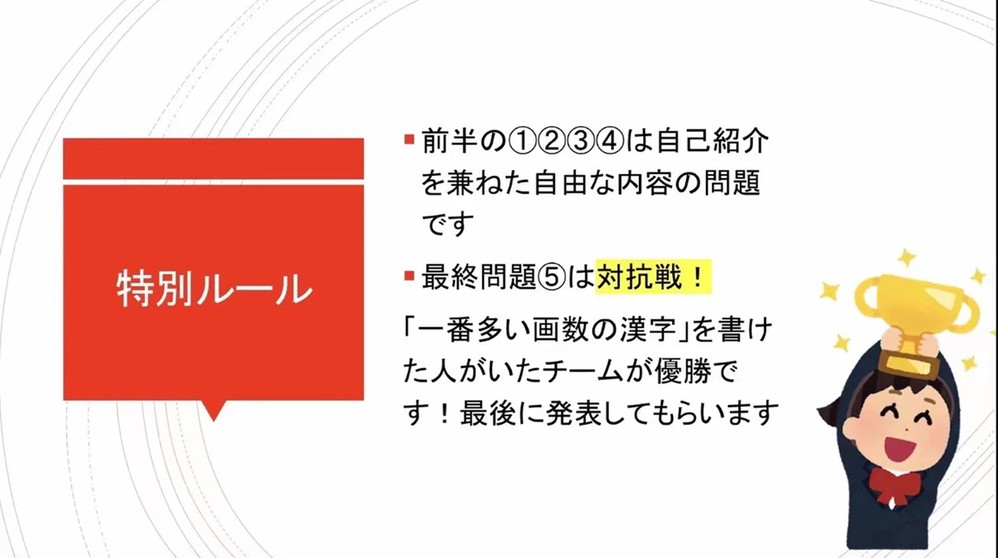 中日双方的同学们通过交流,互相介绍了中日文化、分享了自己的兴趣爱好等。大家通过以“汉字”为主题的游戏,在交流发现中日汉字的异同,探寻有趣的文化差异,获益匪浅。针对不同的游戏题目,大家会按照自己的想法写下一个汉字,并用日语阐述自己的想法。现场气氛活跃,通过交流与游戏,大家成功拉进了彼此的距离,并留下了难忘的回忆。