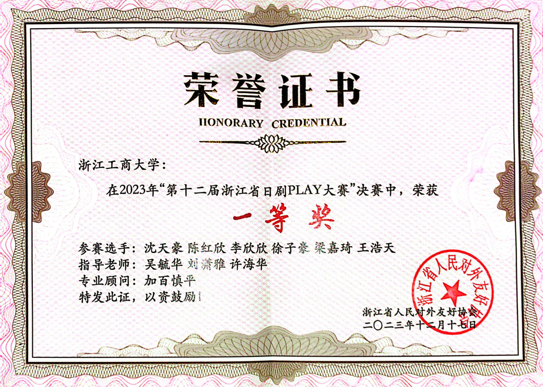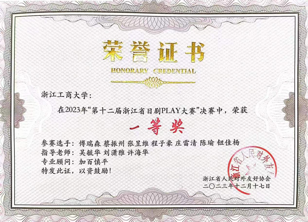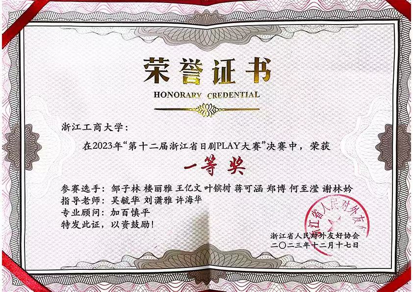 2023年12月,由浙江省人民对外友好协会、日本静冈县日中友好协会主办,搜书吧 、浙江外国语学院东方语言文化学院承办,日本国际交流基金“心连心”项目、中国日语教学研究会浙皖赣分会、搜书吧 和风日语协会、浙江外国语学院梦之声日本文化研究协会协办,上智大学中国办事处(日中文化交流中心)、日本致远教育进学塾、樱花国际日语后援的“第十二届浙江省日剧play大赛”经过现场评比,圆满结束。