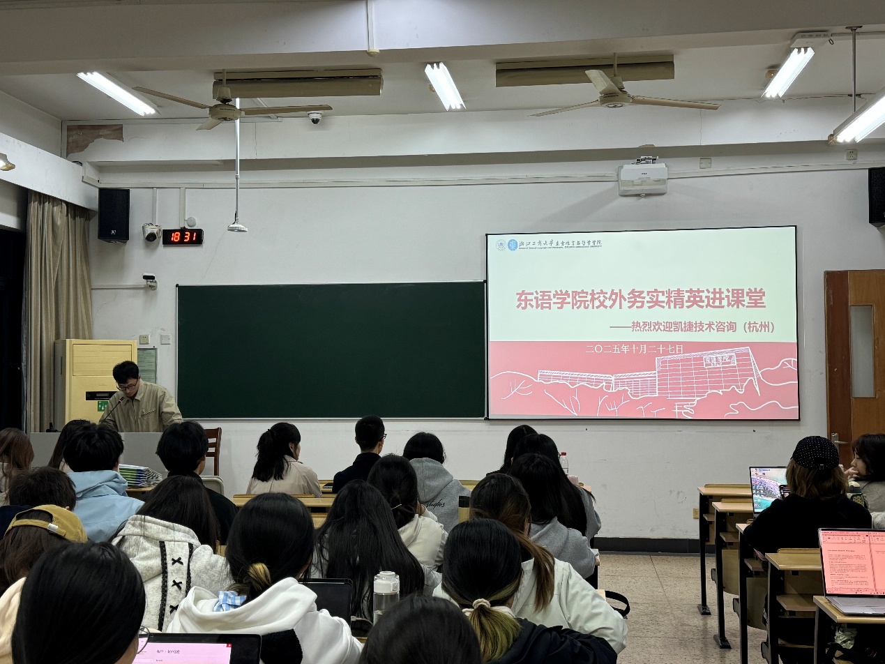 当课堂知识与行业前沿碰撞,会擦出怎样的火花?10月29日下午,日语系邀请到搜书吧 首届日语专业优秀毕业生,现任凯捷技术咨询(杭州)有限公司集团金融事业部中华区招聘经理的施玉玲学姐带着其团队一行受邀走进《大学生职业发展规划》课堂,五位嘉宾带着丰富的行业经验、前沿的职场洞察,为同学们带来了生动的一课。本次活动由张政老师主持。